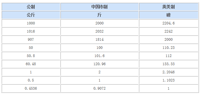 重量單位換算對照表: