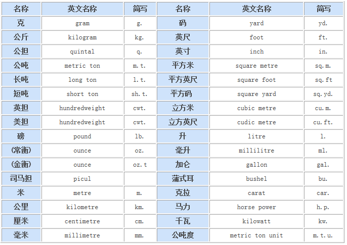 常用度量衡英文名稱和簡寫: