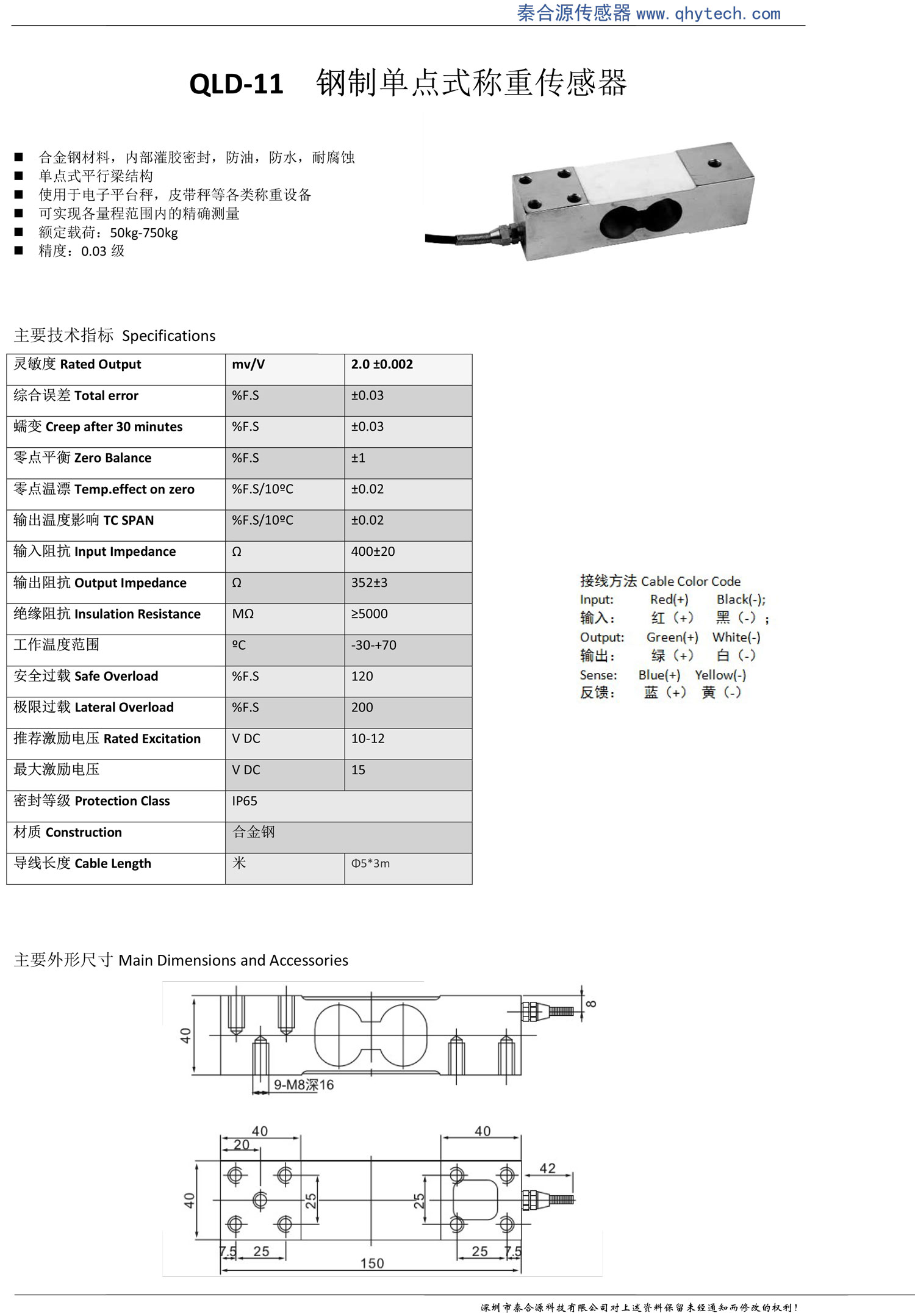 產品特點: 合金鋼材料,內部灌膠密封,防油,防水,耐腐蝕 單點式平行梁結構 使用于電子平臺秤,皮帶秤等各類稱重設備,可實現各量程范圍內的精確測量,額定載荷:50kg-750kg 精度:0.03級; 可實現各量程范圍內的精確測量 額定載荷:50kg-750kg 精度:0.03級