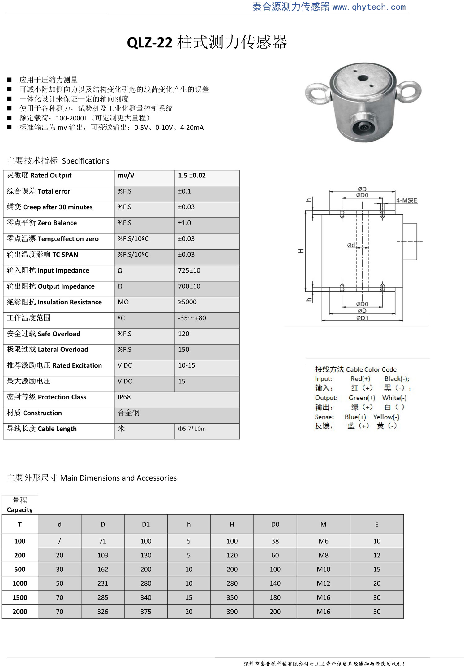 產品特點: 用于壓縮力測量 可減小附加側向力以及結構變化引起的載荷變化產生的誤差 一體化設計來保證一定的軸向剛度 使用于各種測力,試驗機及工業化測量控制系統 額定載荷:100-2000T(可定制更大量程) 標準輸出為mv輸出,可變送輸出:0-5V、0-10V、4-20mA;