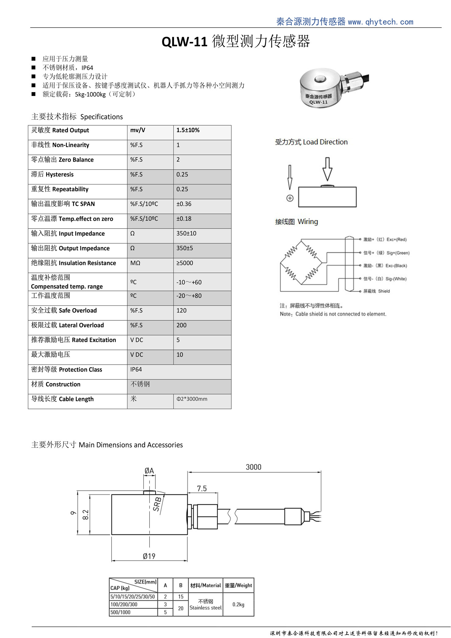 產品名稱:微型測力傳感器QLW-11小空間(5kg-1000kg),φ19mm