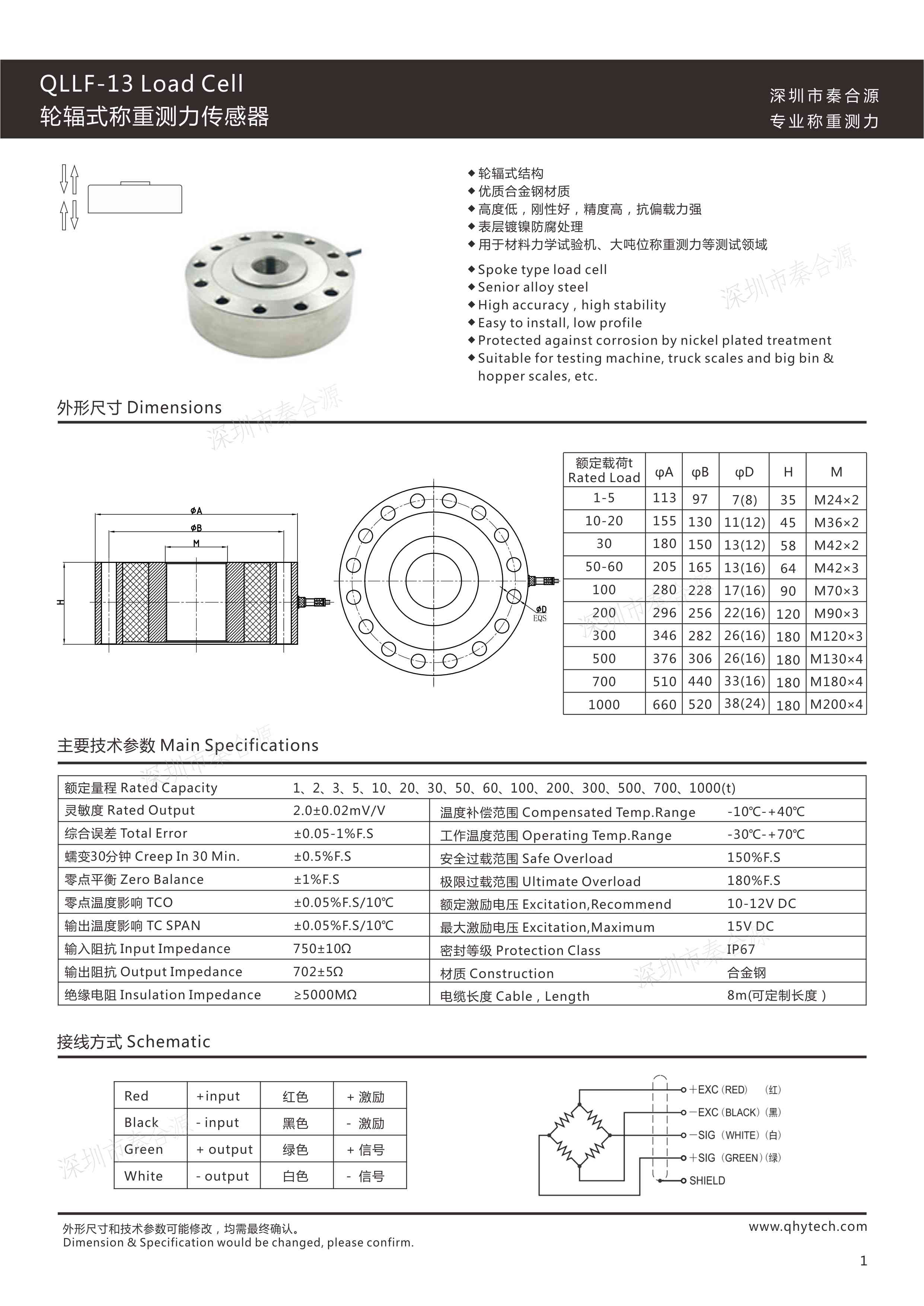 秦合源輪輻式傳感器,選用優質合金鋼,完全密封焊接,防水防腐蝕,高度低抗偏載力強,精度高測力精準,皮實耐用價格實在,適用于多種載荷力的測試,廣泛應用于各種電子稱、水泥配料倉、干粉攪拌機及工業自動化測量控制系統等。常規模擬傳感器輸出信號(靈敏度)為mV信號(0.5mV/V-3mV/V),稱重儀表(測力儀表)可以接收mV信號,即時顯示力值,同時把mV信號放大為電壓信號(0-5V、0-10V)或者電流信號(4-20mA、0-20mA),同PLC對接。秦合源經驗豐富、技術精湛,為各行業用戶提供精準測力傳感器及測力方案。
